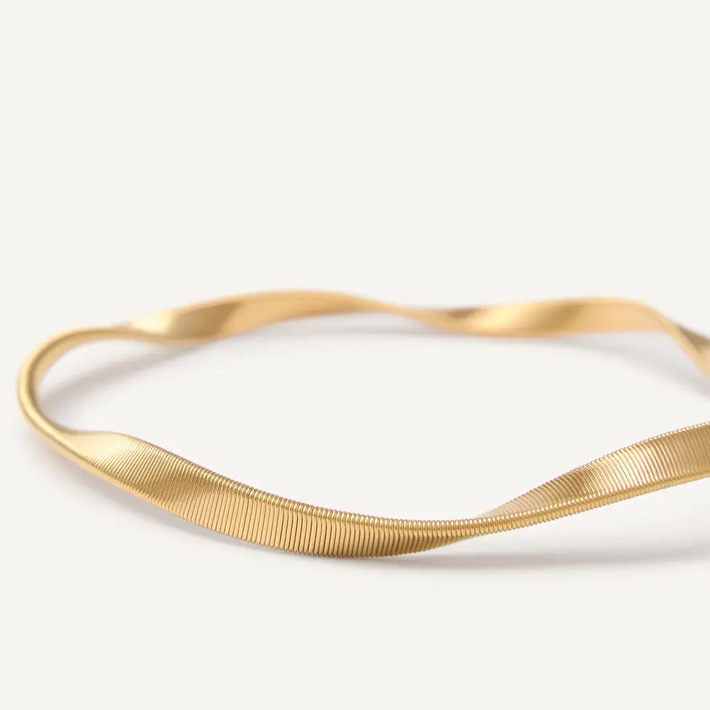 Каждое изделие выполнено из золота 750-й пробы и украшено фирменной техникой ручного скручивания проволоки, которая является визитной карточкой Marco Bicego. Этот приём придаёт украшениям подвижность, текстуру и глубину, благодаря чему они выглядят живыми и неповторимыми. Marrakech включает ожерелья, браслеты, серьги и кольца, нередко дополненные бриллиантами для ещё большего сияния.