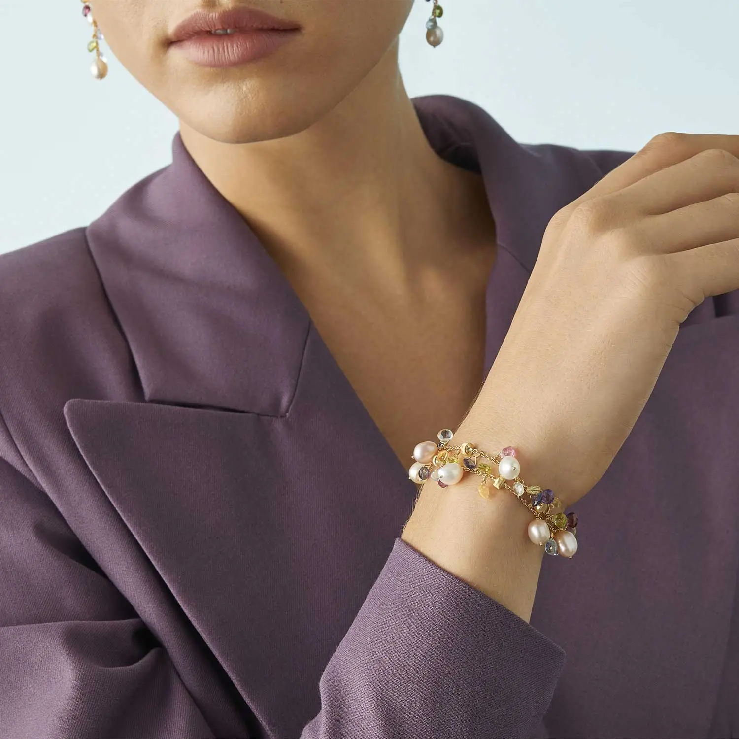 Браслет имеет двухрядный дизайн, где огранённые натуральные камни и жемчуг чередуются с небольшими золотыми бусинами с ручной гравировкой. Бусины украшены традиционной флорентийской техникой bulino, создающей матовую сатиновую текстуру золота, характерную для украшений Marco Bicego.