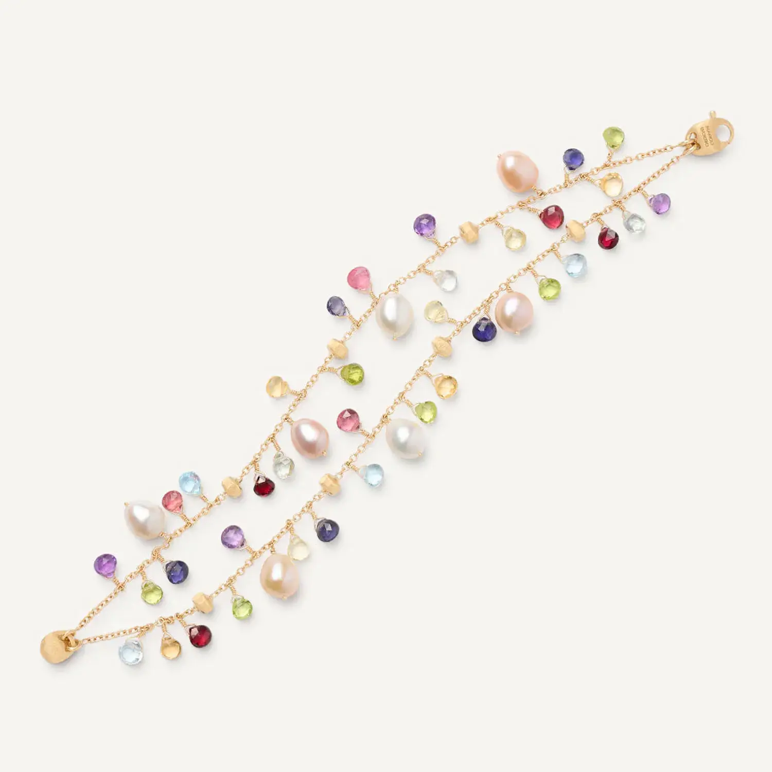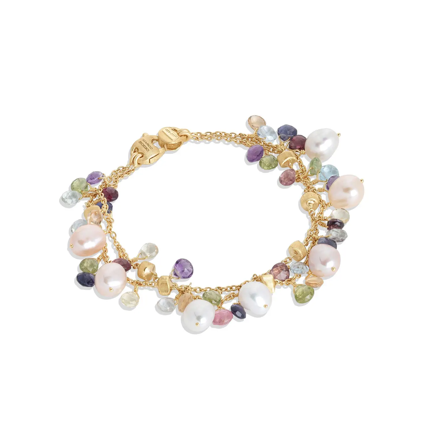 Роскошный золотой браслет Marco Bicego Paradise BB2594 MIX114 Y 02 изготовлен из 18-каратного жёлтого золота (750/1000) и входит в культовую коллекцию Paradise, которая воспевает красоту природных цветных драгоценных камней и элегантность итальянского ювелирного искусства. Браслет сочетает тонкие золотые цепочки с разноцветными камнями и пресноводными жемчужинами, создавая гармоничную и элегантную композицию.