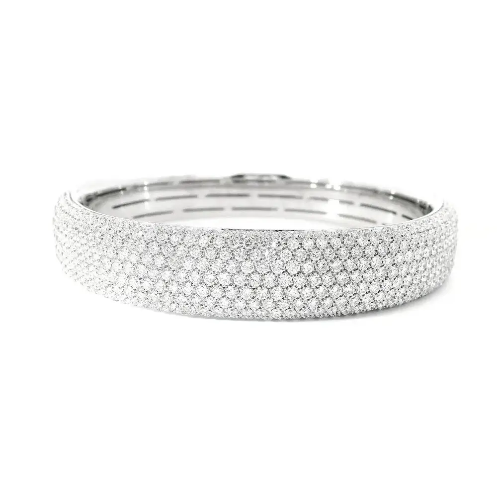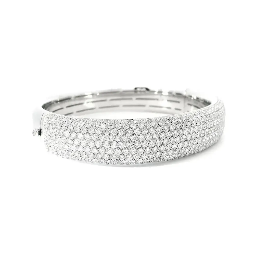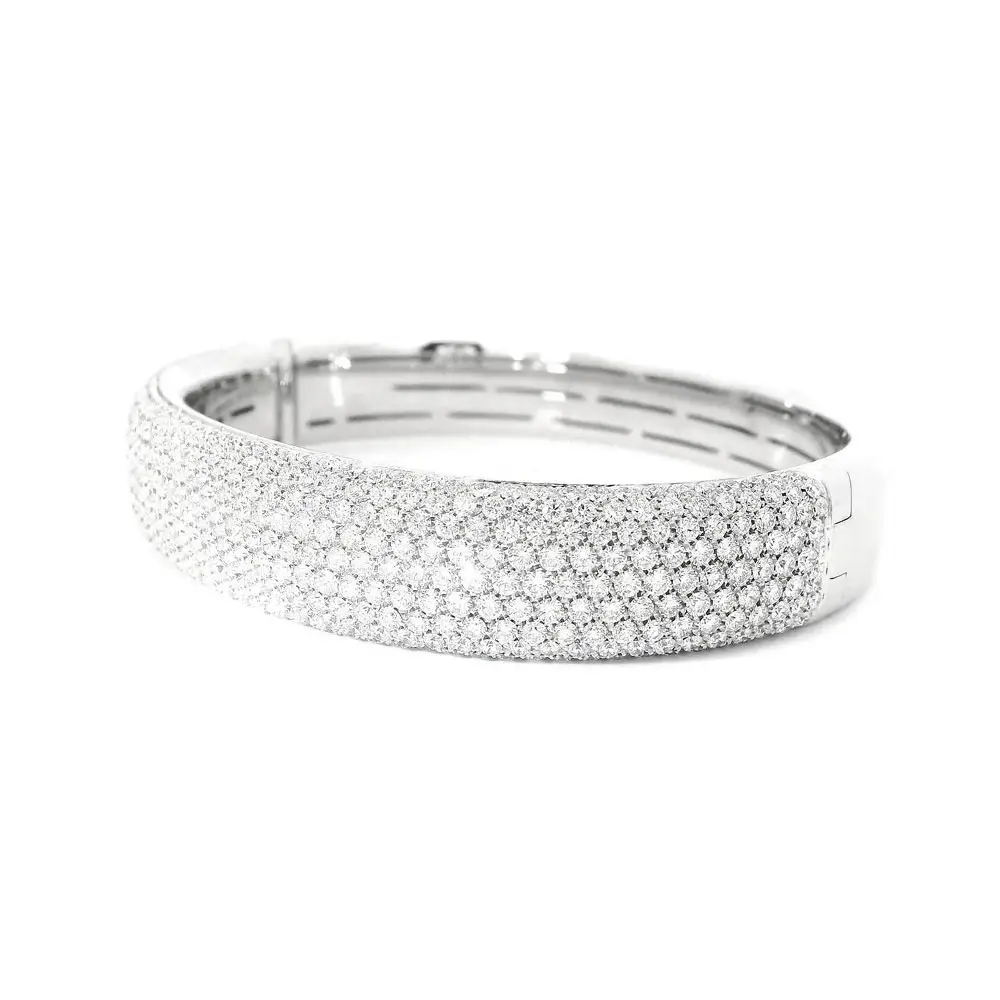 Украшение инкрустировано 710 природными белыми бриллиантами общим весом 12,90 карата, каждый диаметром 1,70 мм. Круглая огранка (Round Brilliant) обеспечивает исключительное сияние и игру света. Камни цвета G и чистоты VS создают равномерное свечение, напоминающее ленту света, обвивающую запястье.