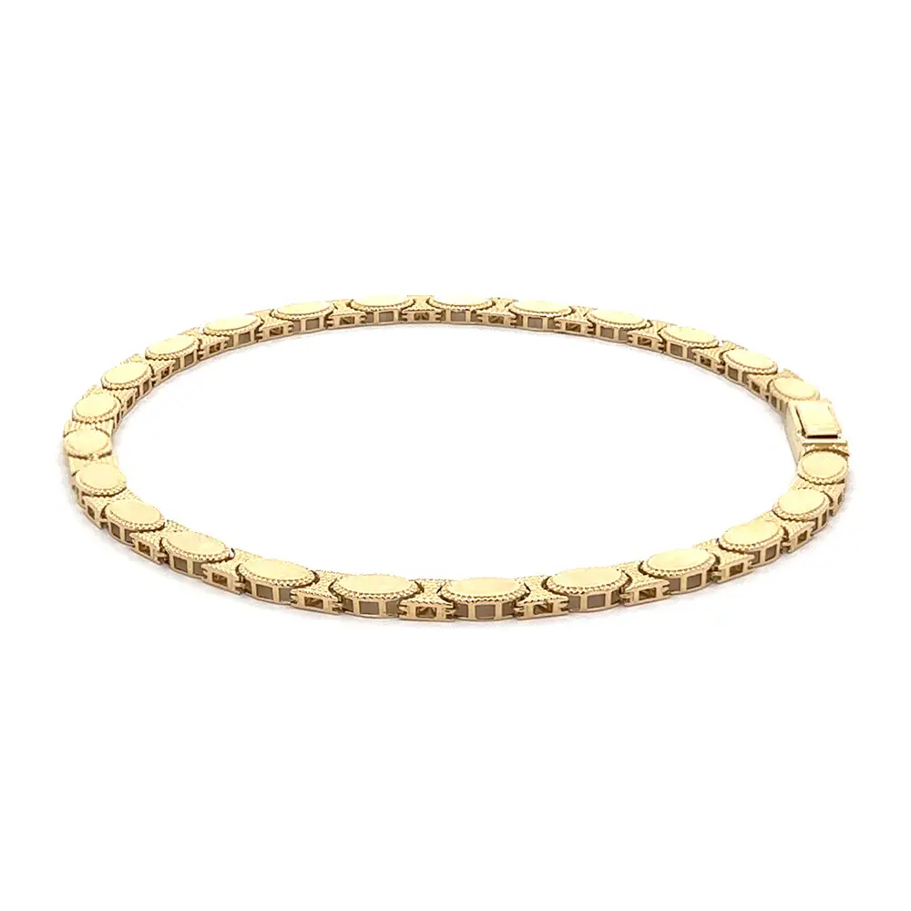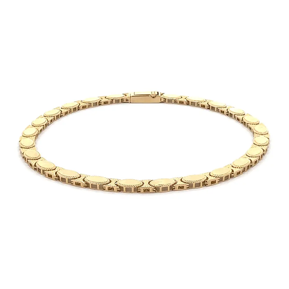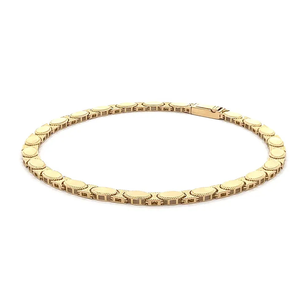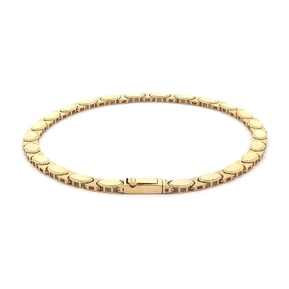 Золотой браслет с овальными звеньями воплощает классическую элегантность и безупречное ювелирное мастерство. Каждое звено аккуратно выполнено в овальной форме и украшено тонкой фактурой, придающей изделию глубину и сияние.