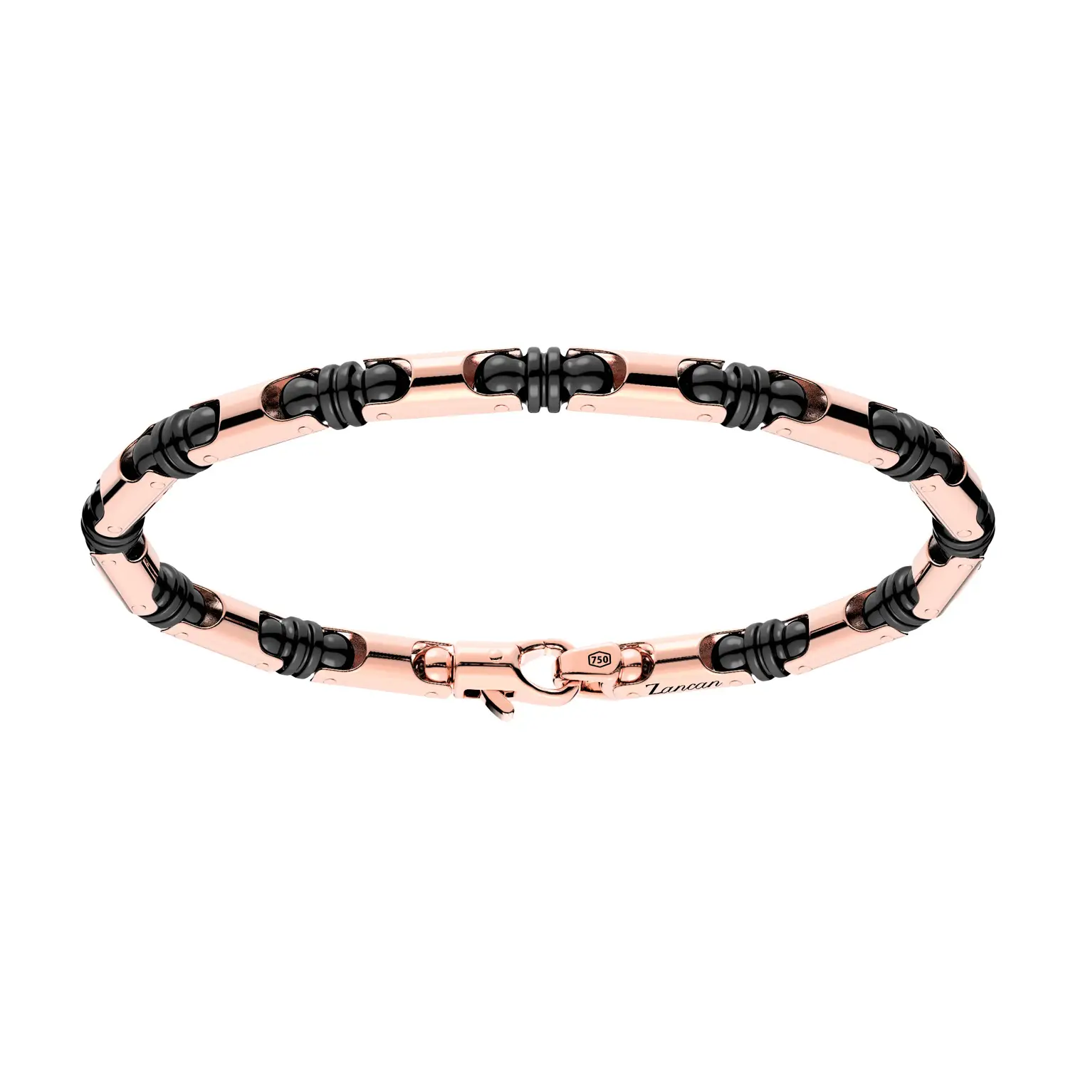 Этот выдающийся мужской браслет Zancan сочетает элегантность розового золота 18 карат с современным характером чёрной технической керамики, создавая яркий контраст и высокую прочность. Каждое звено тщательно сформировано и отполировано до совершенства, образуя динамичное взаимодействие тёплого золотого оттенка и глубокого глянцевого блеска керамики.