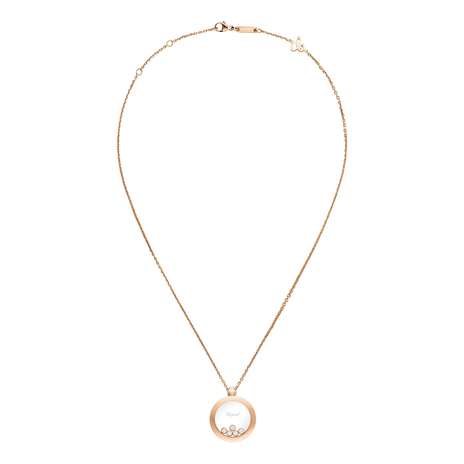 Колье Chopard Happy Diamonds Icons 799434-5001 воплощает женственность и радость жизни. Выполнено из этичного розового золота 18 карат, круглый кулон содержит три свободно движущихся бриллианта общим весом 0,35 карата, заключённых между сапфировыми стёклами — знаменитые «танцующие бриллианты», символ свободы и счастья коллекции Happy Diamonds.