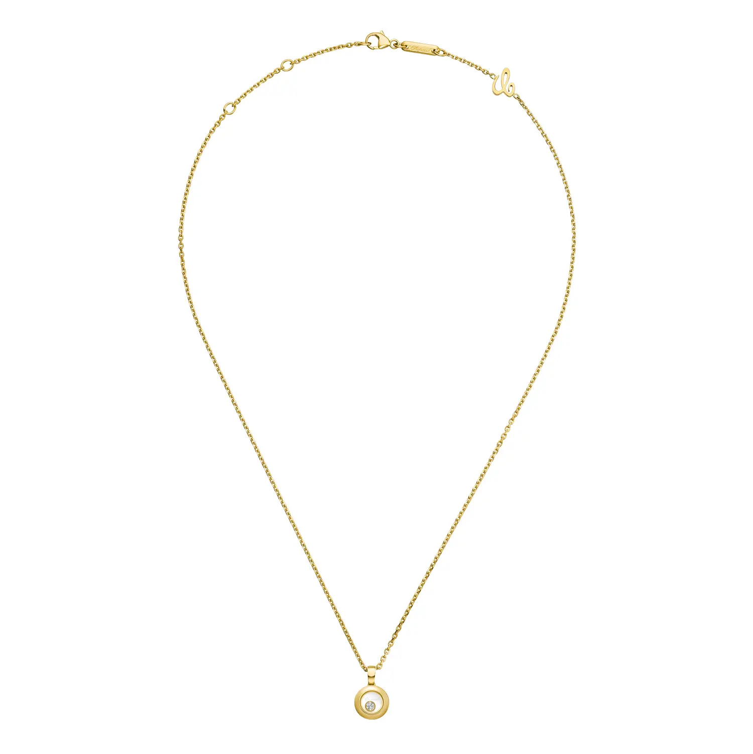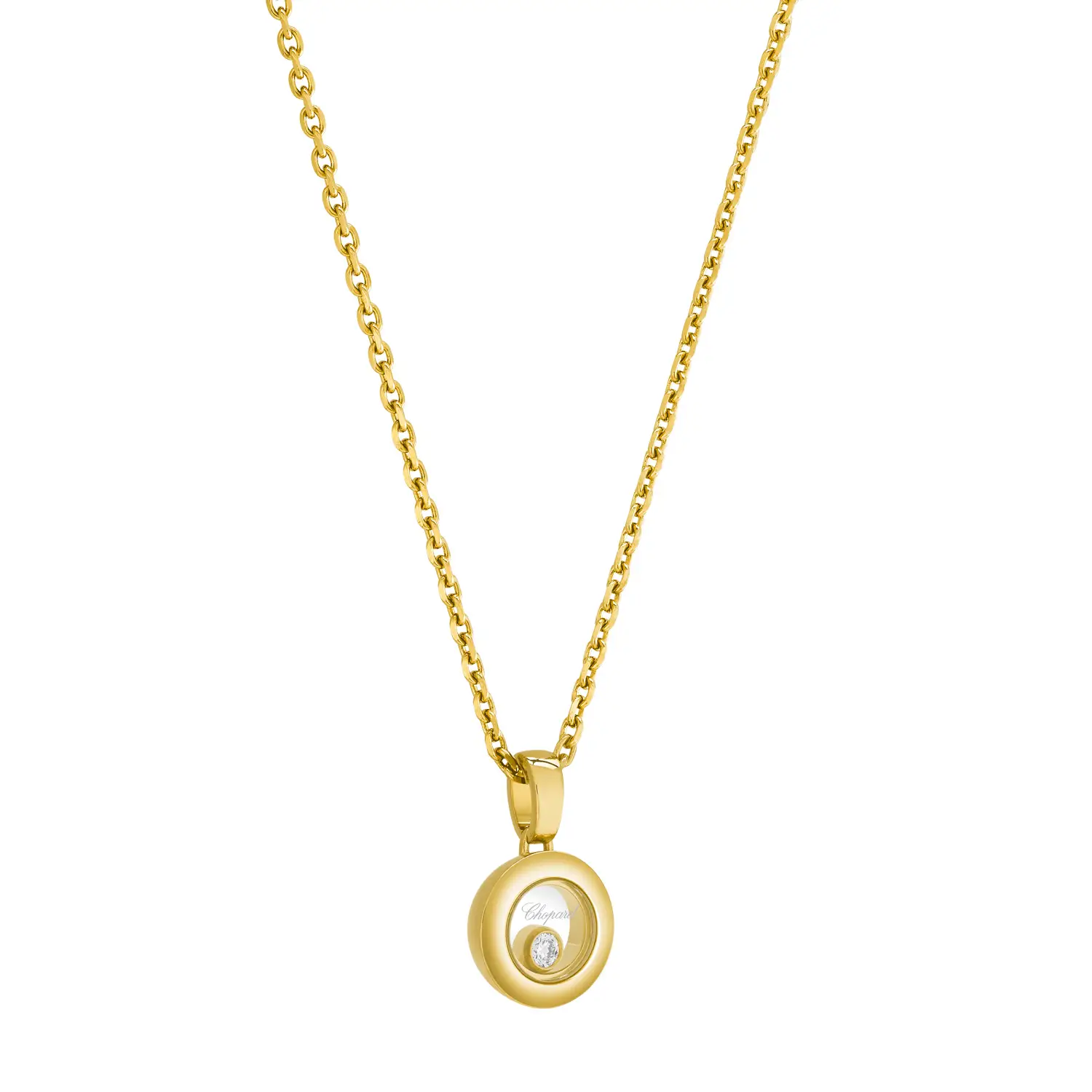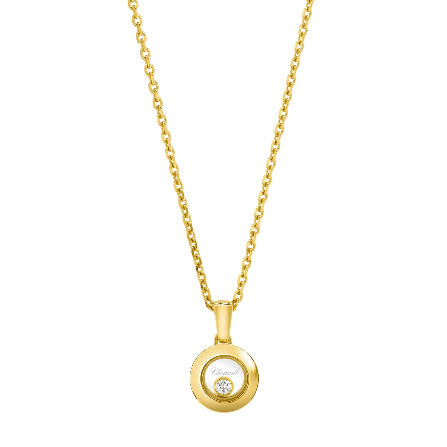 Этот утончённый кулон из коллекции Happy Diamonds Icons излучает радость, элегантность и лёгкость. Изготовлен из 18-каратного жёлтого золота, украшен свободно движущимся бриллиантом весом около 0,05 карата, помещённым между двумя сапфировыми стёклами — символ свободы и женственности. Круглая форма с гравировкой Chopard придаёт украшению гармонию и изысканность.