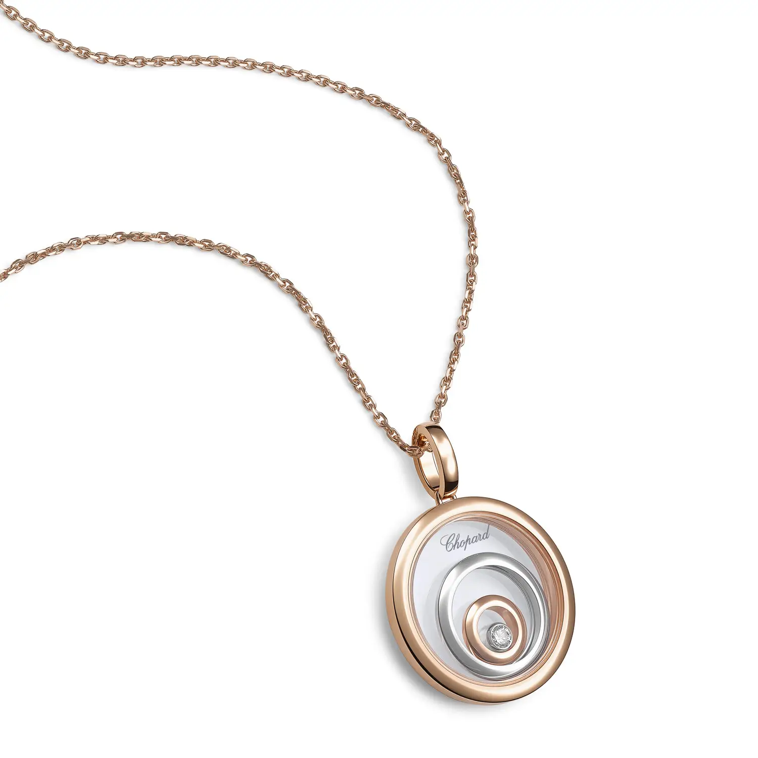 Кулон Chopard Happy Spirit 798231-9001 воплощает гармонию, свет и движение — суть коллекции Happy Spirit. Изготовлен из сочетания этичного розового и белого золота 18 карат, украшен концентрическими кругами, символизирующими спокойствие и баланс. В центре между двумя сапфировыми стёклами свободно движется бриллиант весом 0,09 карата, создавая фирменный эффект «танцующего бриллианта» — символ свободы и радости.