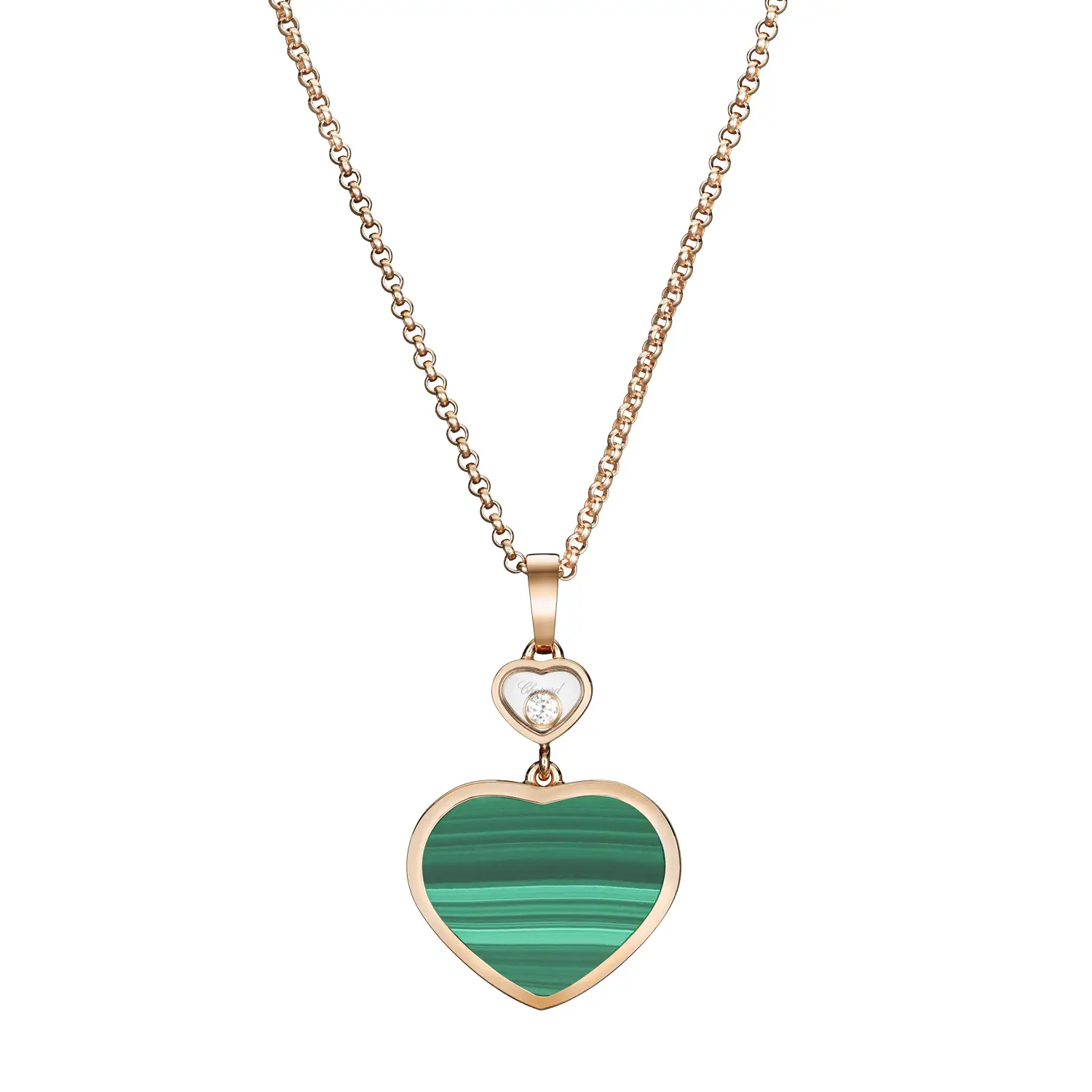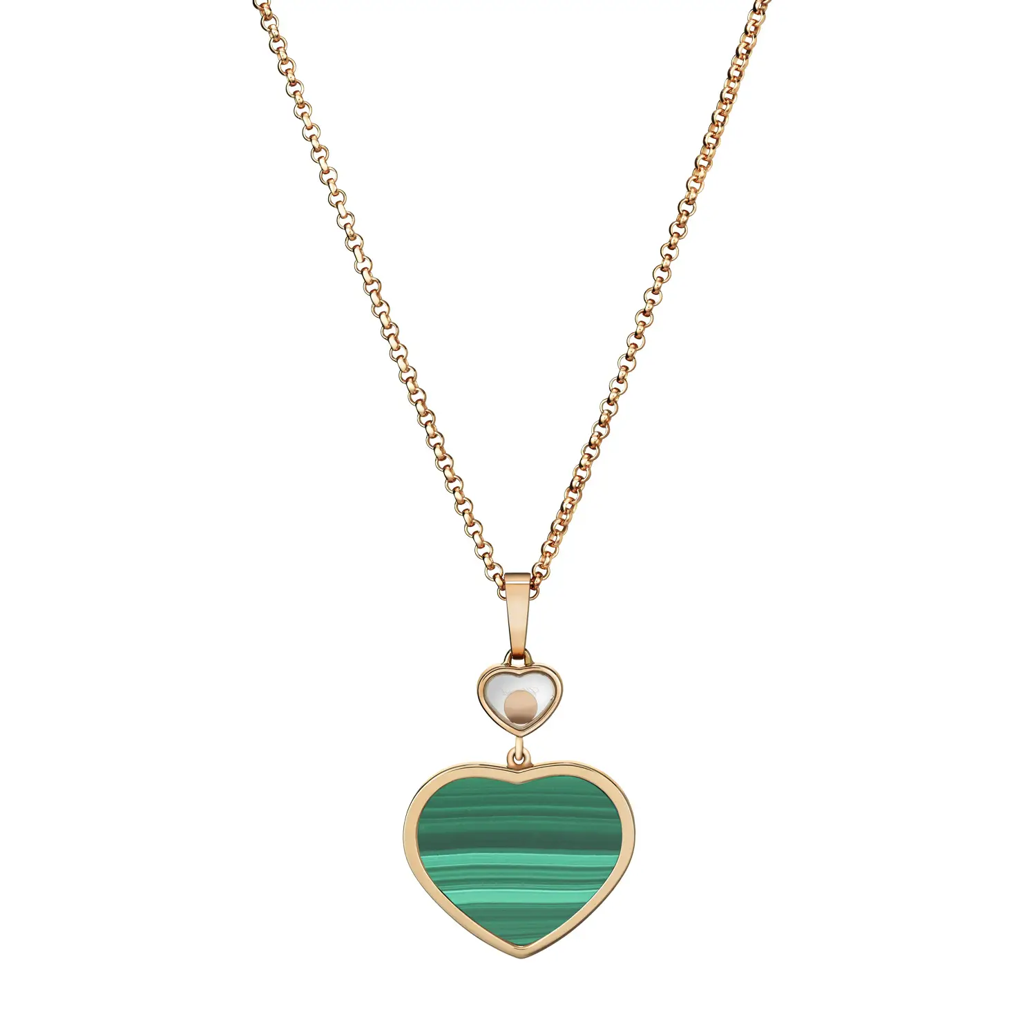Дизайн украшения основан на двух знаковых сердцах: большее из них украшено завораживающим натуральным малахитом глубокого зелёного цвета, чья уникальная структура напоминает слои земли и символизирует гармонию и спокойствие. В меньшем сердце находится свободно движущийся круглый бриллиант весом 0,05 карата, чистотой IF–VVS и цветом F–G, который мягко сверкает при каждом движении, даря кулону живое сияние.