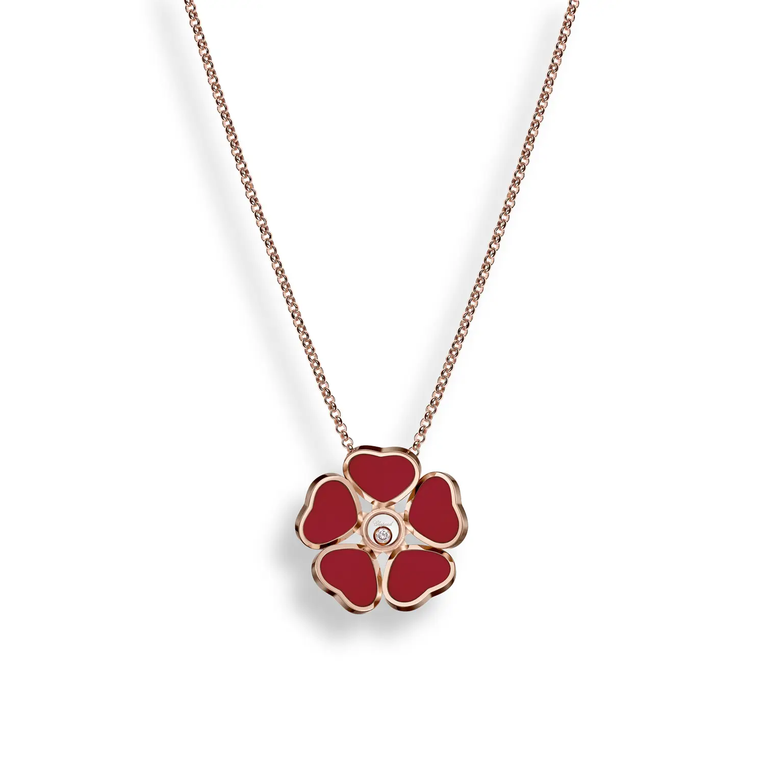 Она выполнена из 18-каратного розового золота (750/1000) с гладкой полированной поверхностью; подвеска объединяет форму цветка и сердца, символизирующих женственность, нежность и любовь – в одном выразительном и запоминающемся изделии.