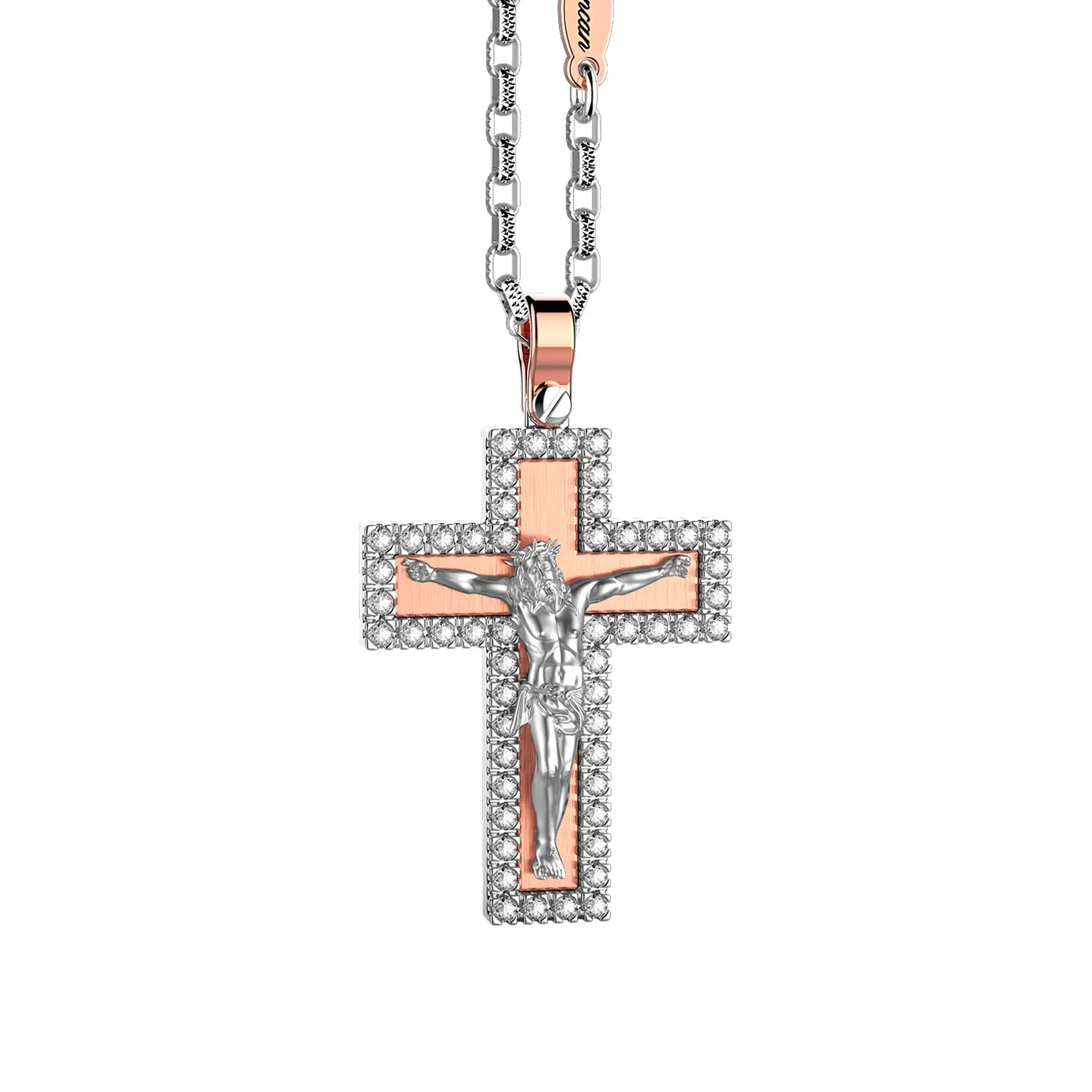 Zancan Couture EC901RB — выразительный кулон, объединяющий современный дизайн с личным символом веры. Выполнен из золота 18 карат (750/1000) в двухцветном сочетании белого и розового с утончённым контрастом полировка / мат, с мотивом креста (религиозный); носится на цепи 60 см — уместен на каждый день и для особых случаев.