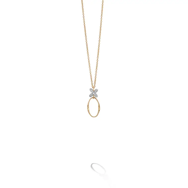 Подвеска Marco Bicego Marrakech Onde CG830 B3 YW — это сочетание итальянской элегантности и мастерства в каждом штрихе. Изготовлена из комбинированного золота 18 к (750/1000) — теплого жёлтого и благородного белого, с матовой поверхностью, создающей изысканный контраст. Размер украшения 29 × 12 мм, длина цепочки 42 см — идеально сбалансированные пропорции для элегантного силуэта.