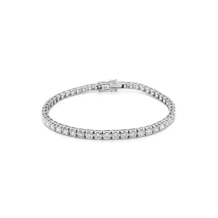 Браслет инкрустирован натуральными белыми бриллиантами круглой огранки (Round) общей массой 4,15 карата, цвета G–H и чистоты VS. Каждый камень мастерски закреплён вручную, создавая непрерывную линию света вокруг запястья — эффект, присущий только подлинным теннисным браслетам.